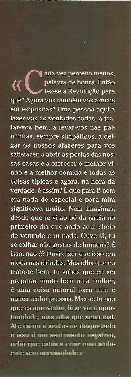 Nesta viagem pelas longas paisagens transmontanas, entrecortadas por desvios súbitos e perigosos, tal como as antigas linhas de via estreita da região, o leitor é conduzido pela mão de personagens que insultam e provocam gargalhadas na mesma frase, com um humor contagiante, que varia entre a temperança e a exaltação.